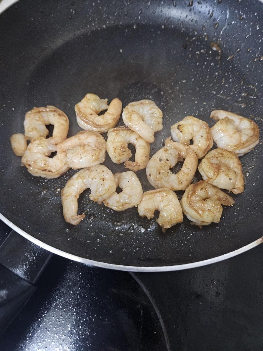 남은 기름에 새우까지 태우듯이 익혀준다
