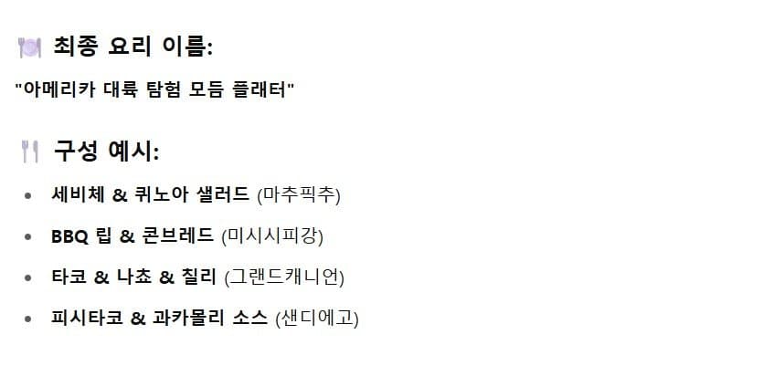요리대회) 마추픽추 유적의 미시시피강 그랜드캐니언 샌디에고 모듬