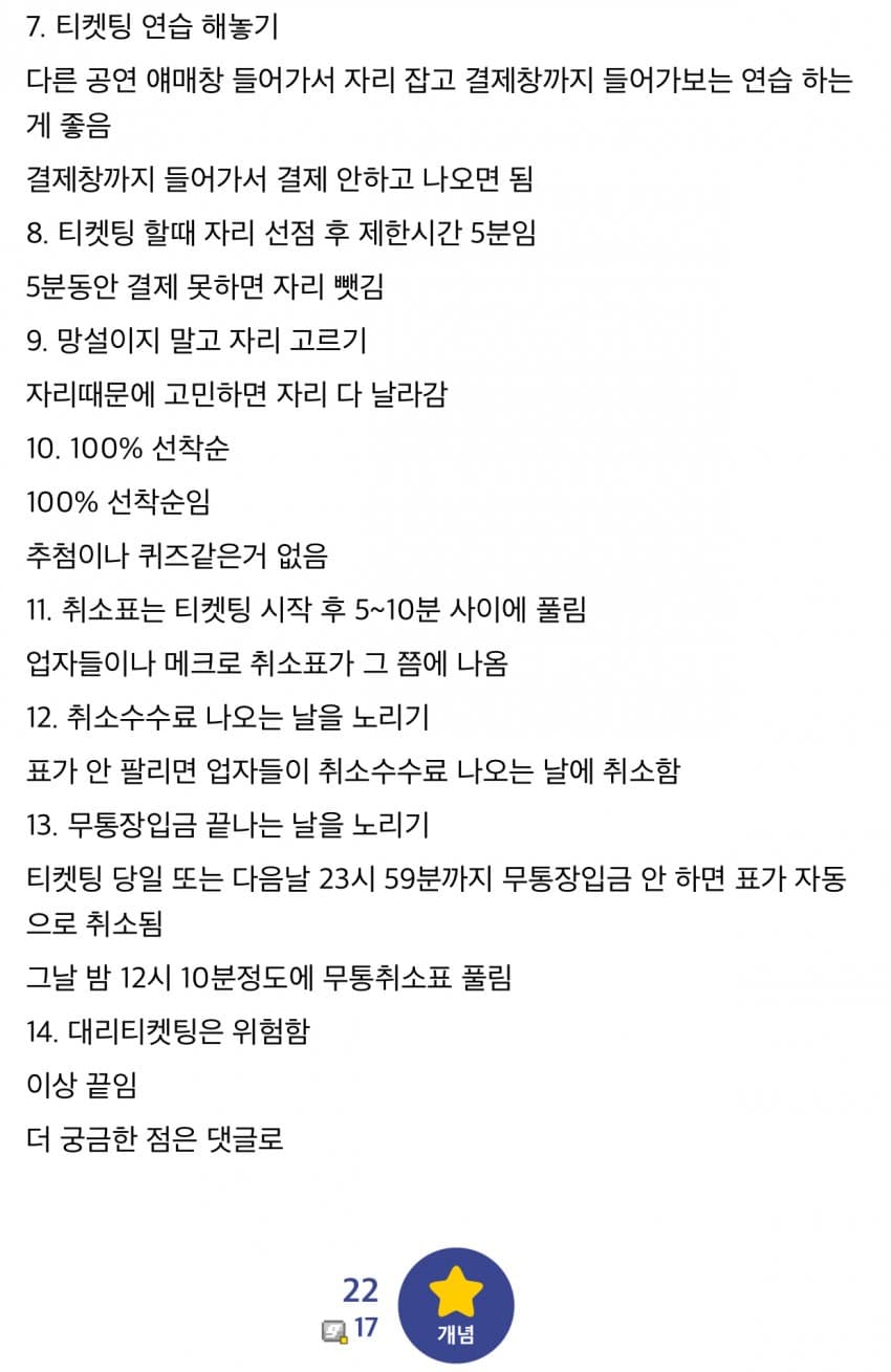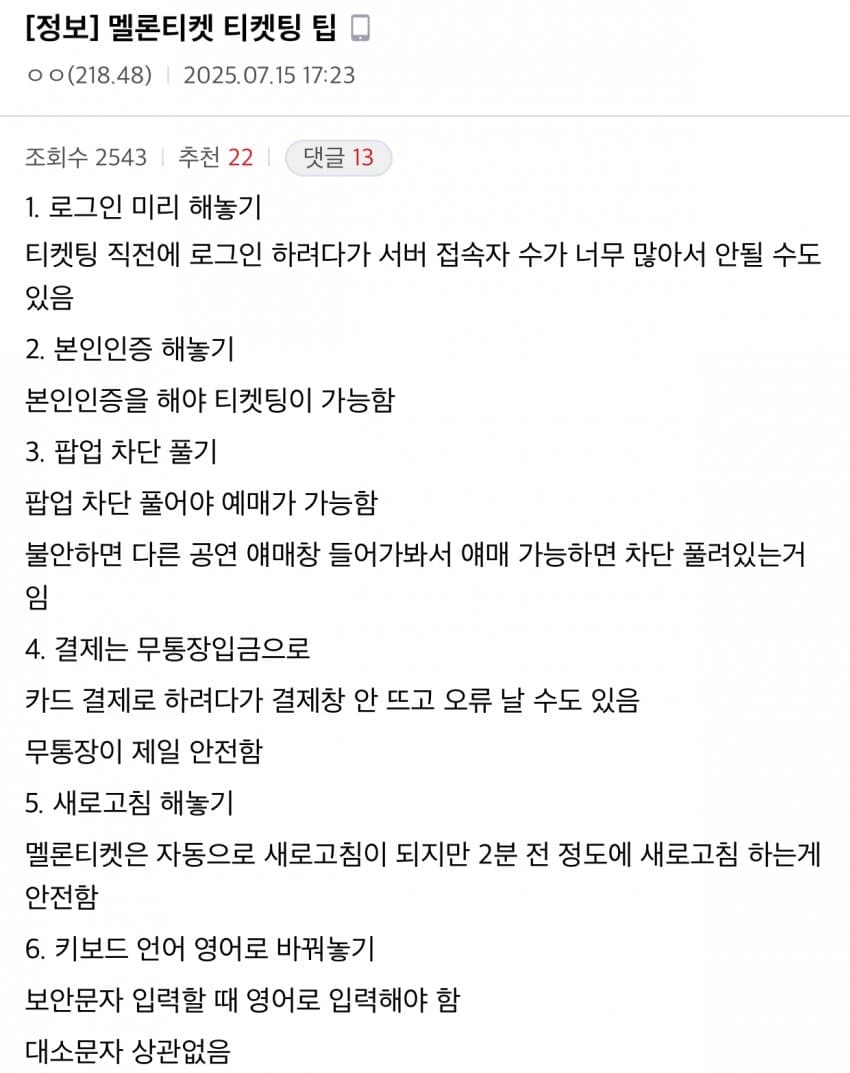 1. 로그인 미리 해놓기티켓팅 직전에 로그인 하려다가 서버 접속자 수가 너무 많아서 안될 수도 있음2. 본인인증 해놓기본인인증을 해야 티켓팅이 가능함3. 팝업 차단 풀기팝업 차단 풀어야 예매가 가능함불안하면 다른 공연