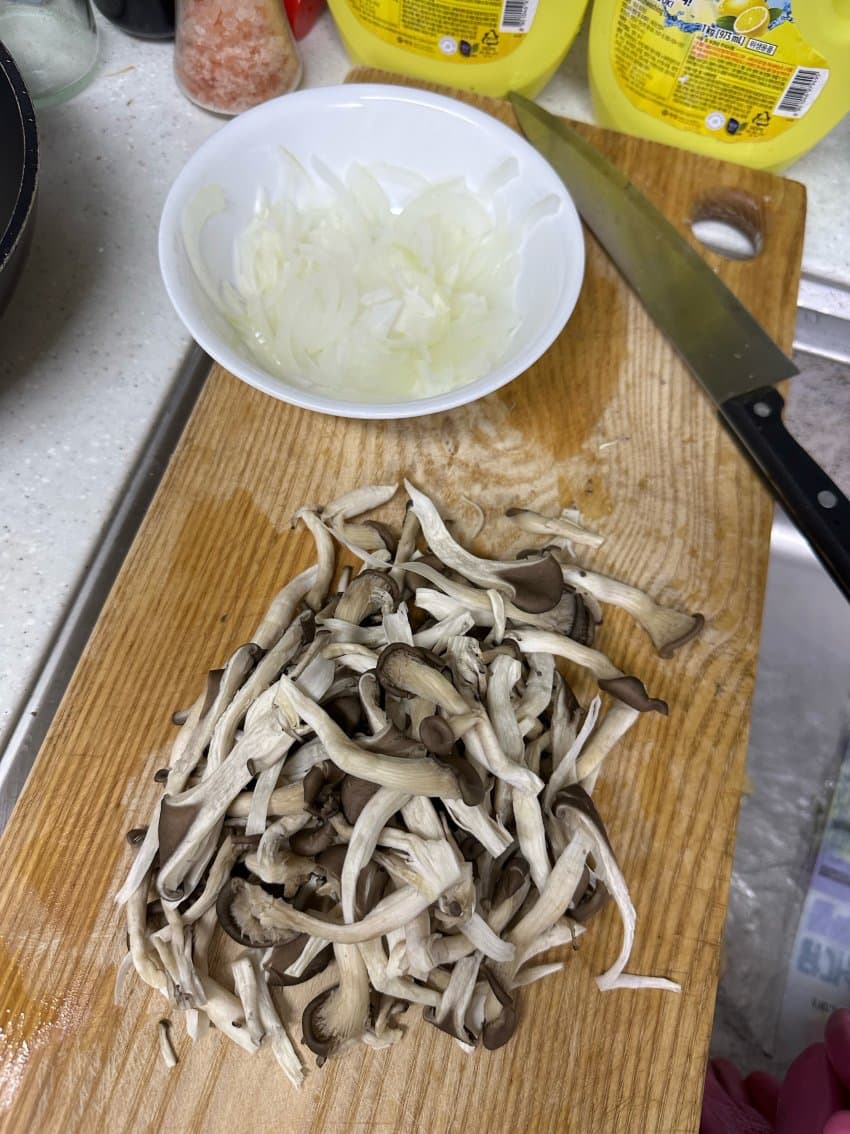 원래 버섯은 양송이나 표고처럼 오래 볶았을때 고점이 높은 버섯 써야하는데 돈 없어서 한팩에 990원짜리 느타리 사왔어.