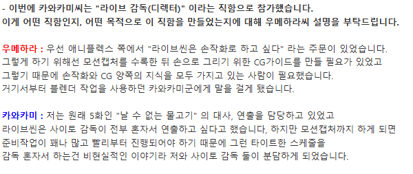 방식 : 모션캡처 > 3D레이아웃 제작 > 그림 콘티(약 일주일 간 진행)