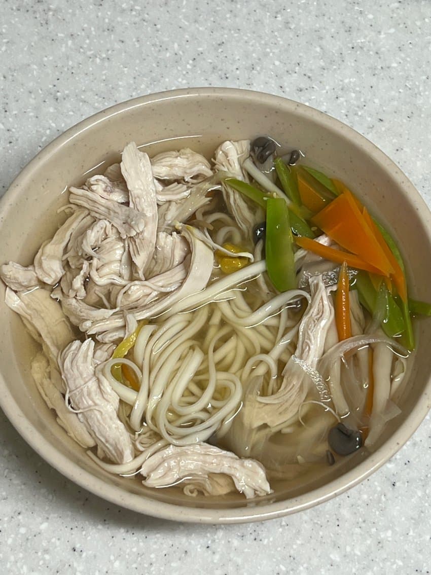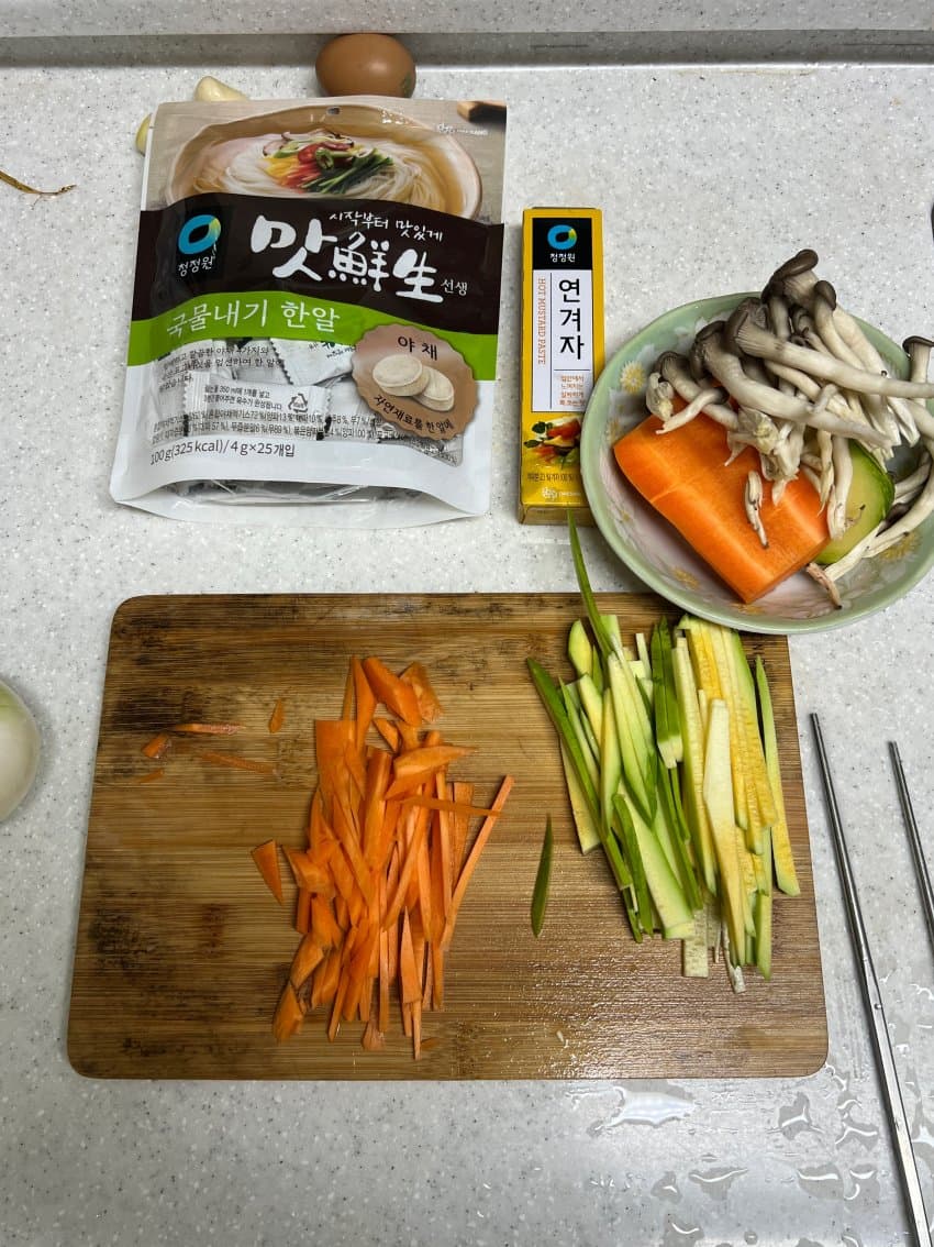 중면삶고 채수 육수 반국자만 넣고 냉면 육수 반팩 닭가슴살 겨자 올리면 끝