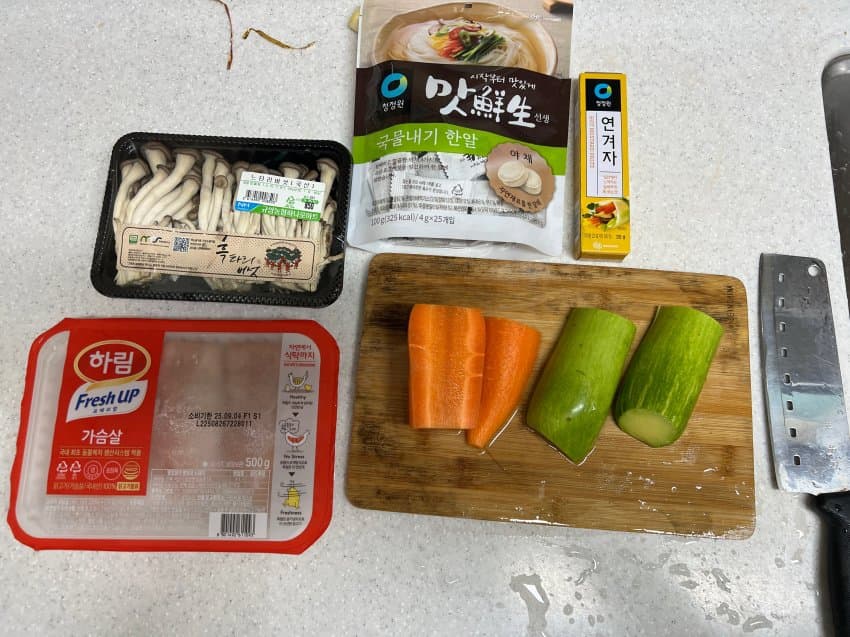 본인은 채수내는데 신경을 썼기 때문에 모든 과정이 귀찮으면 냉면 육수에 겨자 조금 풀고 가슴살 올려서 그대로 먹어도 된다
