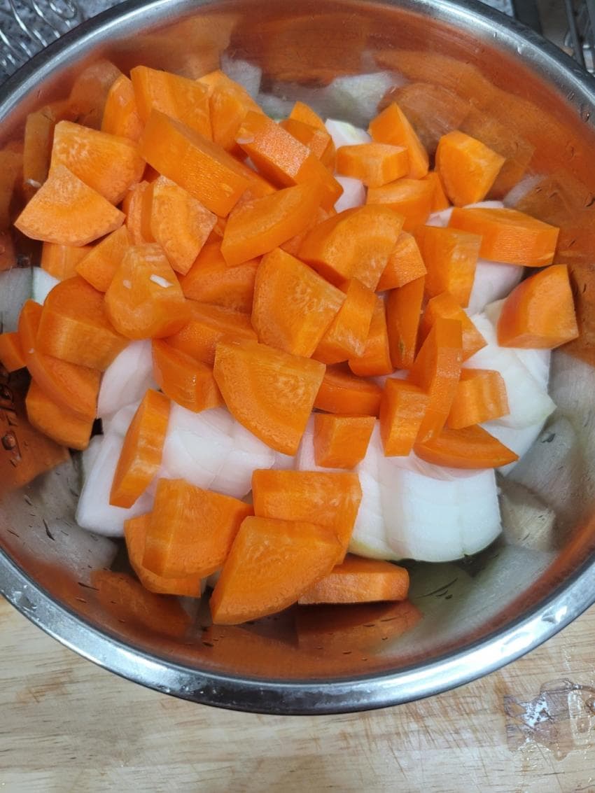 들어간 재료는 양파 2개, 당근 1개, 소 힘줄 1kg, 부채살 200g, 홀 토마토, 버터, 다진 마늘, 소금, 후추, 다진 마늘, 월계수 잎, 레드 와인
