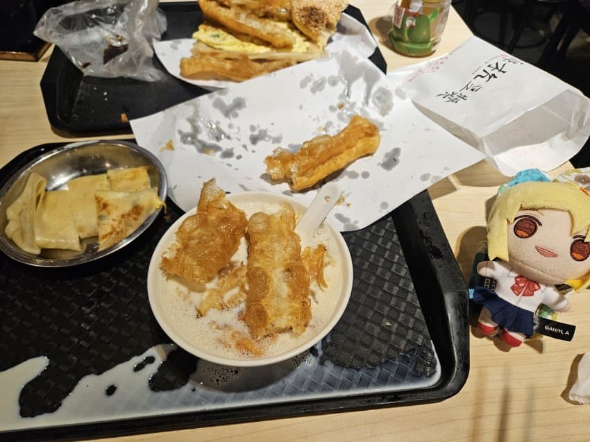 3일차는 밥먹고 가야겠다 해서 또우장이라고 두유에다가 요우띠아요(꽈배기같은거) 파는 집 갔음. 푸항또우장이라고 구글맵 치면 나오는데 난 또우장에 요우띠아요랑 딴삥(계란 조금 들어간 빵) 시킴.