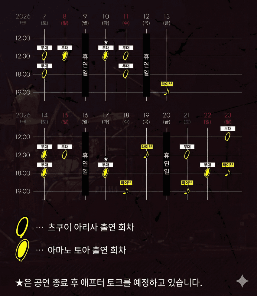공연 초연(7일) 천추락(23일) 라이브 초연(13일) 애프터 토크?(10일, 17일) 공연 예매시 경쟁 치열할 것으로 예상