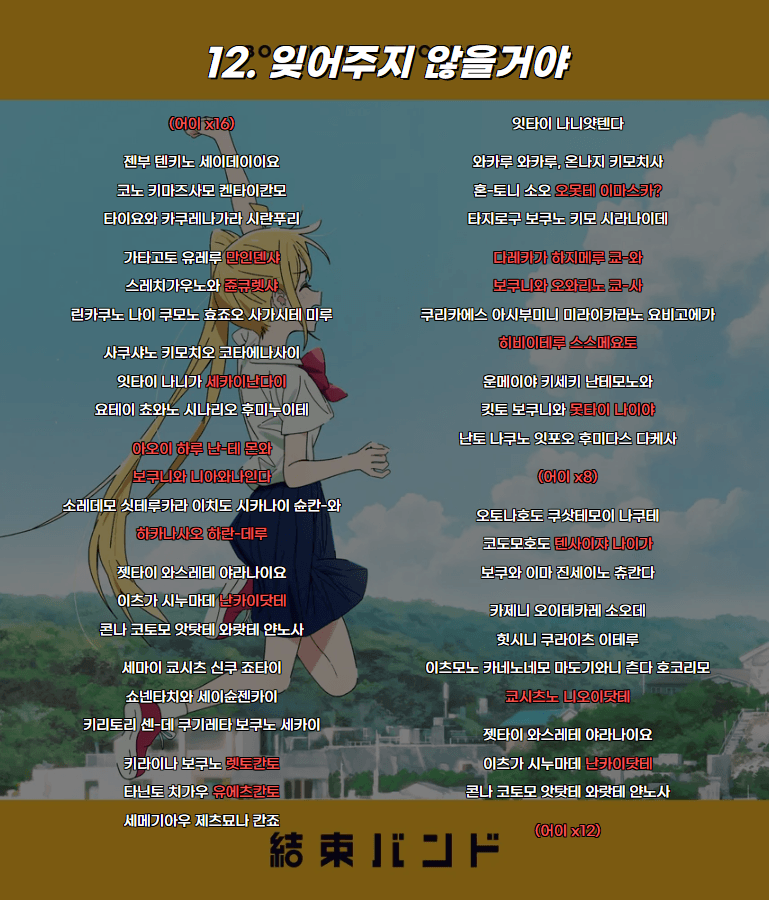 주황색 : 떼창? (호응이 약했거나 기억이 가물가물한 파트. 선택 사항)