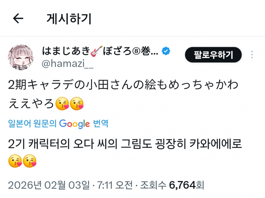 개인 트윗에 남긴 2기 캐릭터에 대한 평,