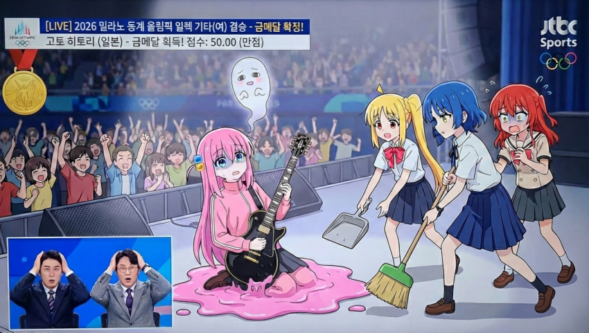 캐스터: "네... 어... 시상식에는 본래의 형태를 되찾아서 올라올 수 있기를 바라며... 엄청난 반전 매력을 보여준 고토 히토리 선수의 금메달 소식을 전해드립니다! 여기는 파리입니다!"