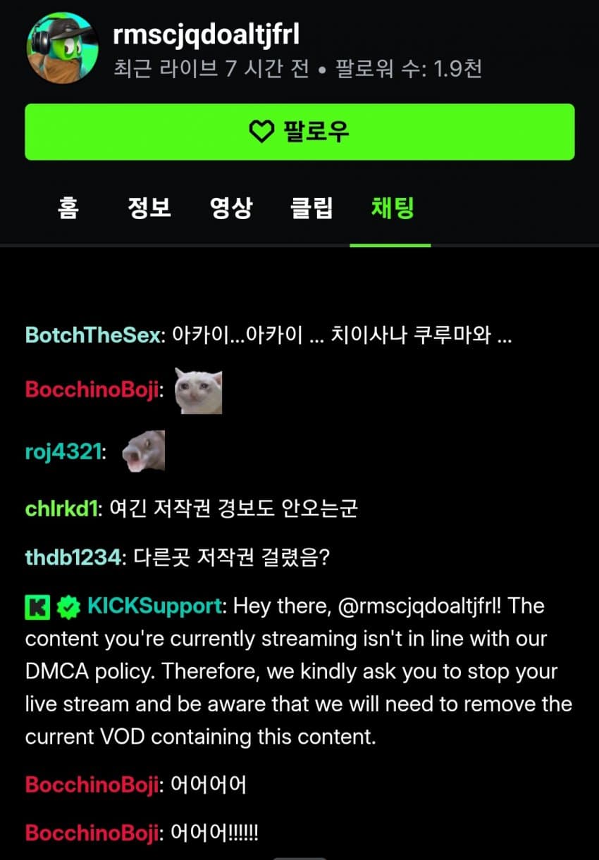 킥에서 약 3년간 꾸준히 하던 무한봇치 중계방 오늘 킥 운영자한테 DMCA 저작권 위반통보받고 사라졌습니다 지금까지 감사했습니다 GOAT시여...