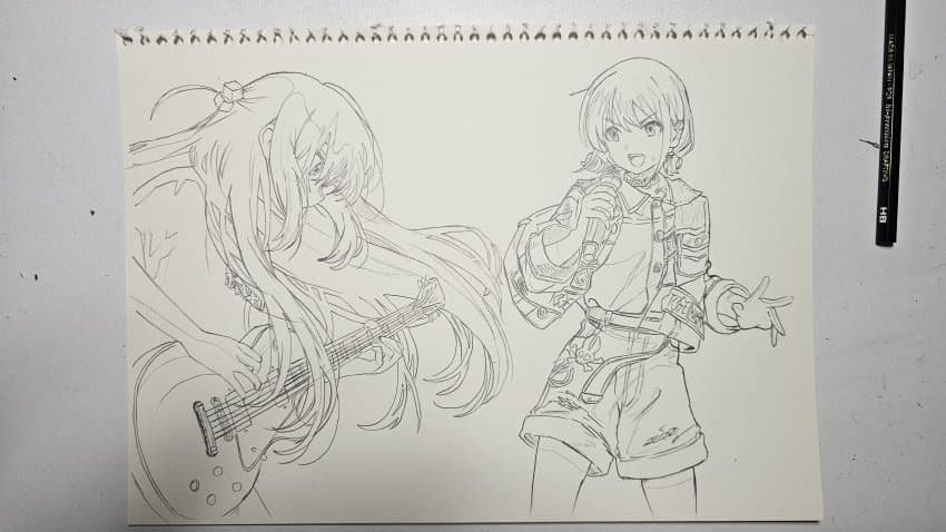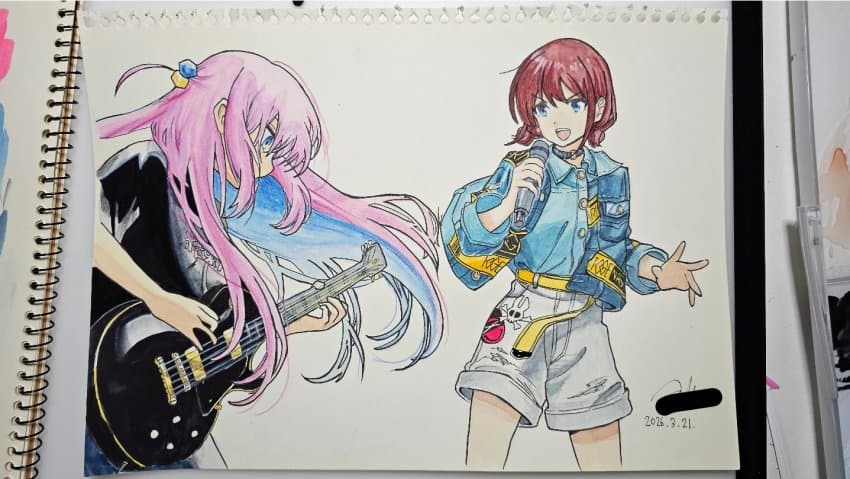 고3 올라오면서 색연필을 구매했기 때문에 봇치의 흩날리는 머리카락은 색연필로 묘사. 눈동자도 색연필로 그라데이션을 줌. 기타줄도 자를 대고 색연필로 그림. 근데 기타줄이 시발 좀 ㅈ된거같다..