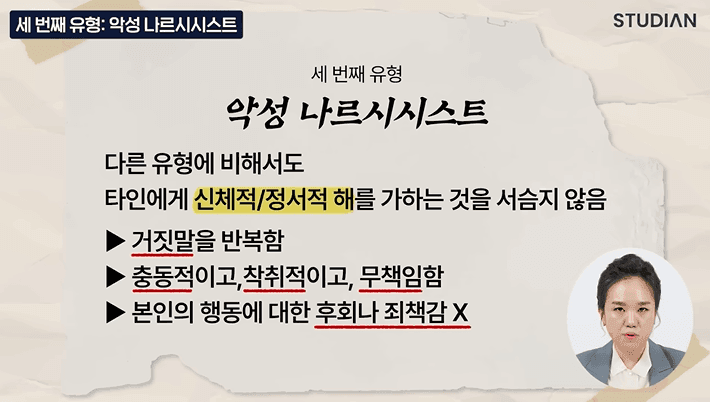 당사자 주변인들에게 물리적 혹은 정신적 피해를 끼칠 수 있는 자기애성인격장애이며