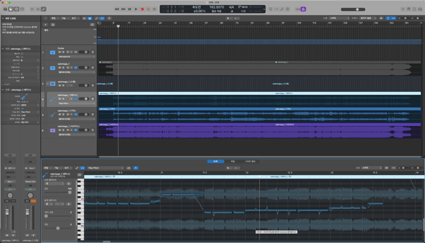 분리된 베이스 트랙을 flex pitch로 설정해줌 (command F) 이후 드롭다운에서 폴리포닉 - flex pitch로 변경