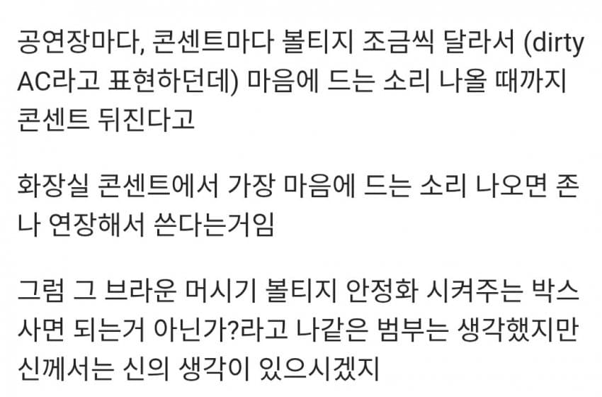 7. 공연장에서 맘에 드는 소리 나오는 콘센트 찾는다고 화장실 같은데서 전원 끌어다 쓰기도 함