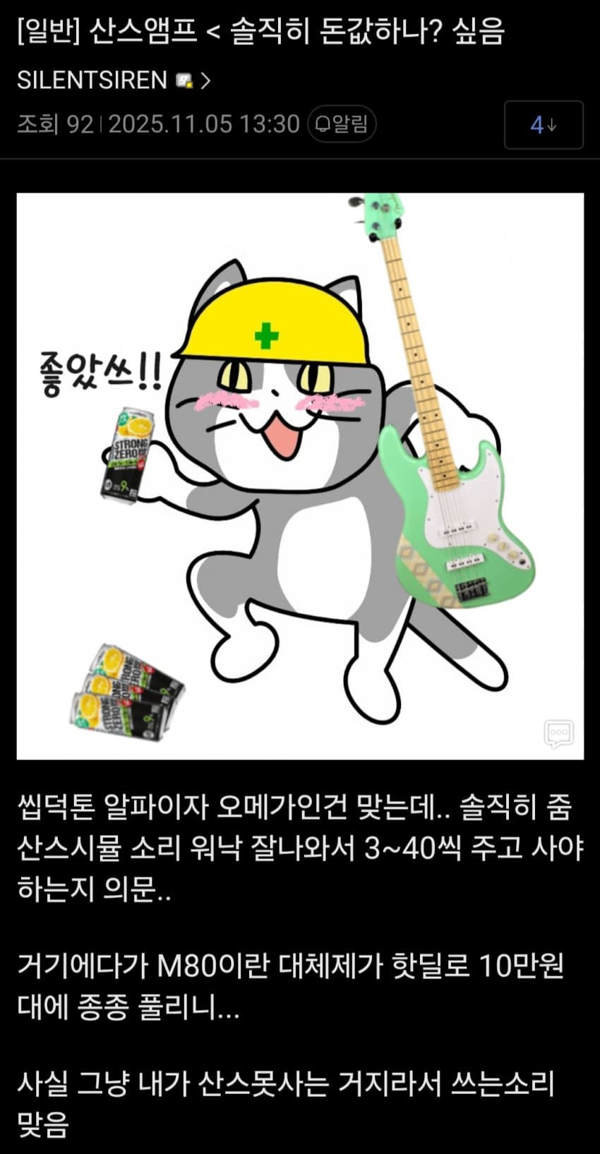 저는 베이스 엘릭서랑 산스앰프실물 다 좋아하는데 굳이 그렇게 왜 말을 하십니까.... 물론 산스는 그렇다 쳐도 베릭서는 좀 긁혔습니다