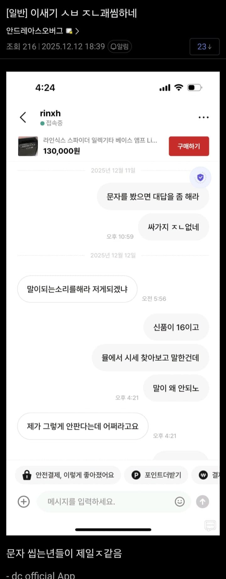 파는건 판매자맘인거 ㅇㅈ 근데 답장안해줘서 긁힌듯 그리고 내가 실수한것도 인정함 밖이라 집가면 영상올려드림 - dc App