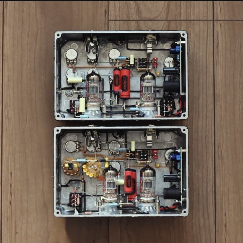 진공관 2개가 박혀있고 내부에서 300v로 승압하여 작동 진짜 앰프의 프리앰프 부분을 그대로 따온 작동 방식