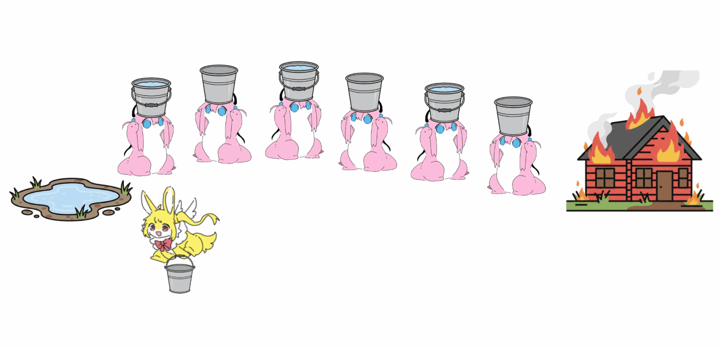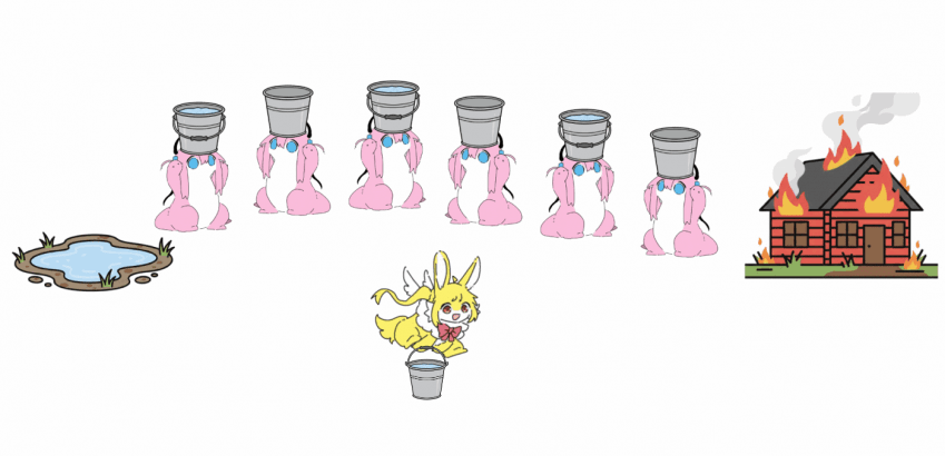 열심히 머리를 짜낸 봇제비들은 웅덩이부터 오두막까지 쭉 늘어서서 양동이로 물을 옮겨받으면서 끄기로 함