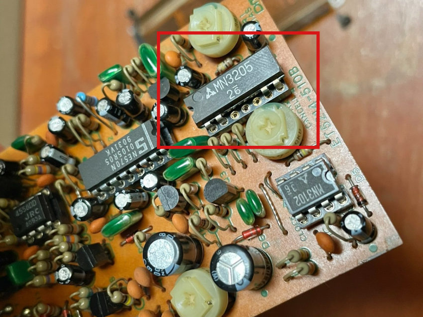 보스 DM-2 딜레이의 내부에도 이 BBD 칩(마츠시타 MN3205)이 들어가 있다. (아래에 MN3102도 BBD 칩임)