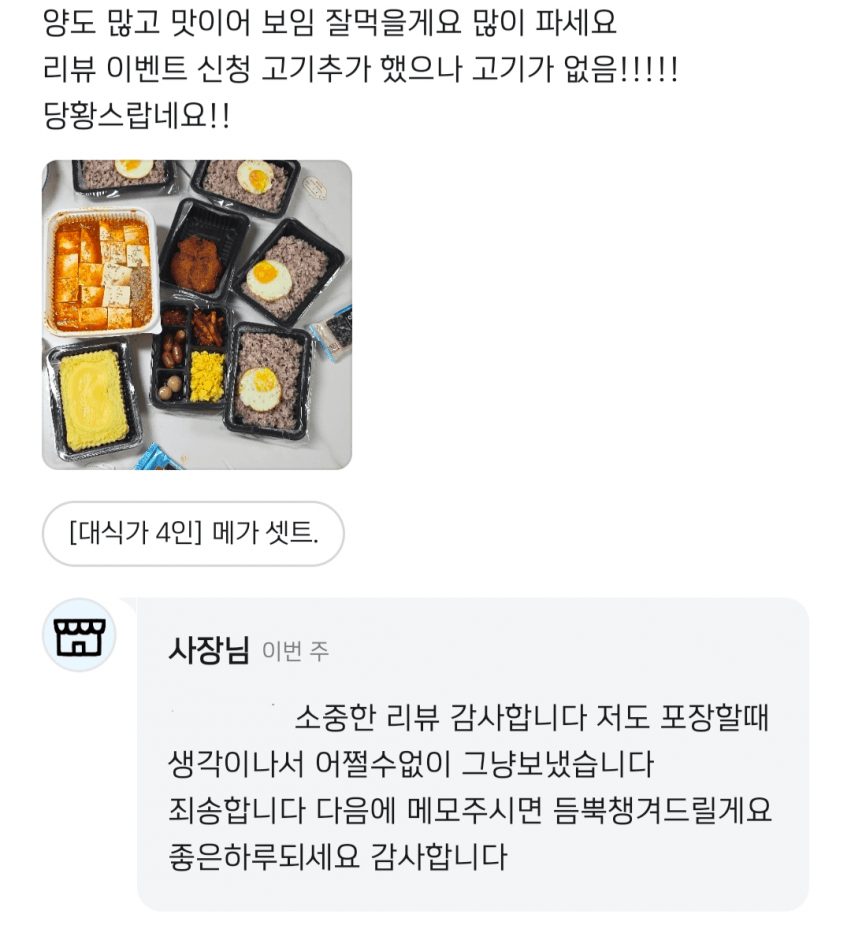 4인세트 비싼거 주문하면서 리뷰이벤트 고기추가 요청했는데