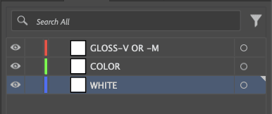 아까 말했던 white, gloss 레이어에도 각각 프린팅될 범위를 지정해 줘야함. 직사각형 대충 아무렇게나 만들어서 아무색이든 구분이 되게 만듬. white레이어에서 기준으로 하나 만들고 그냥 복붙하는게 제일 편함.