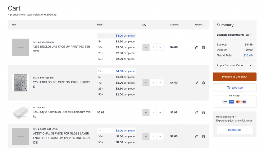 먼저 인클로저 본품를 하나 고름. 색상이나 재질은 본인이 원하는 걸로 고르면 됨. 그리고 그 인클로저에 맞는 uv 프린팅 서비스를 하나 담는다. 그리고 글로스 레이어를 추가한 사람들은 글로스레이어도 따로 담아줘야 한다. 마지막으로 홀가공 서비스도 담으면 끝 페달 한개당 16불 정도 나온다.