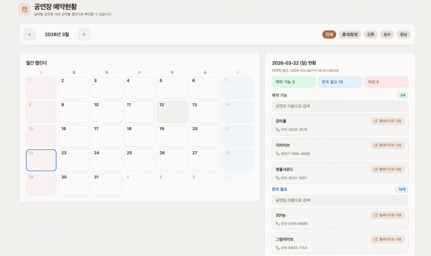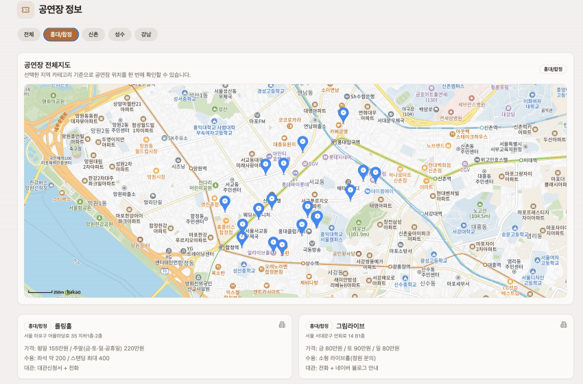 그래서 공연장 대관 정보도 확인 가능하게 정보 제공합니다.