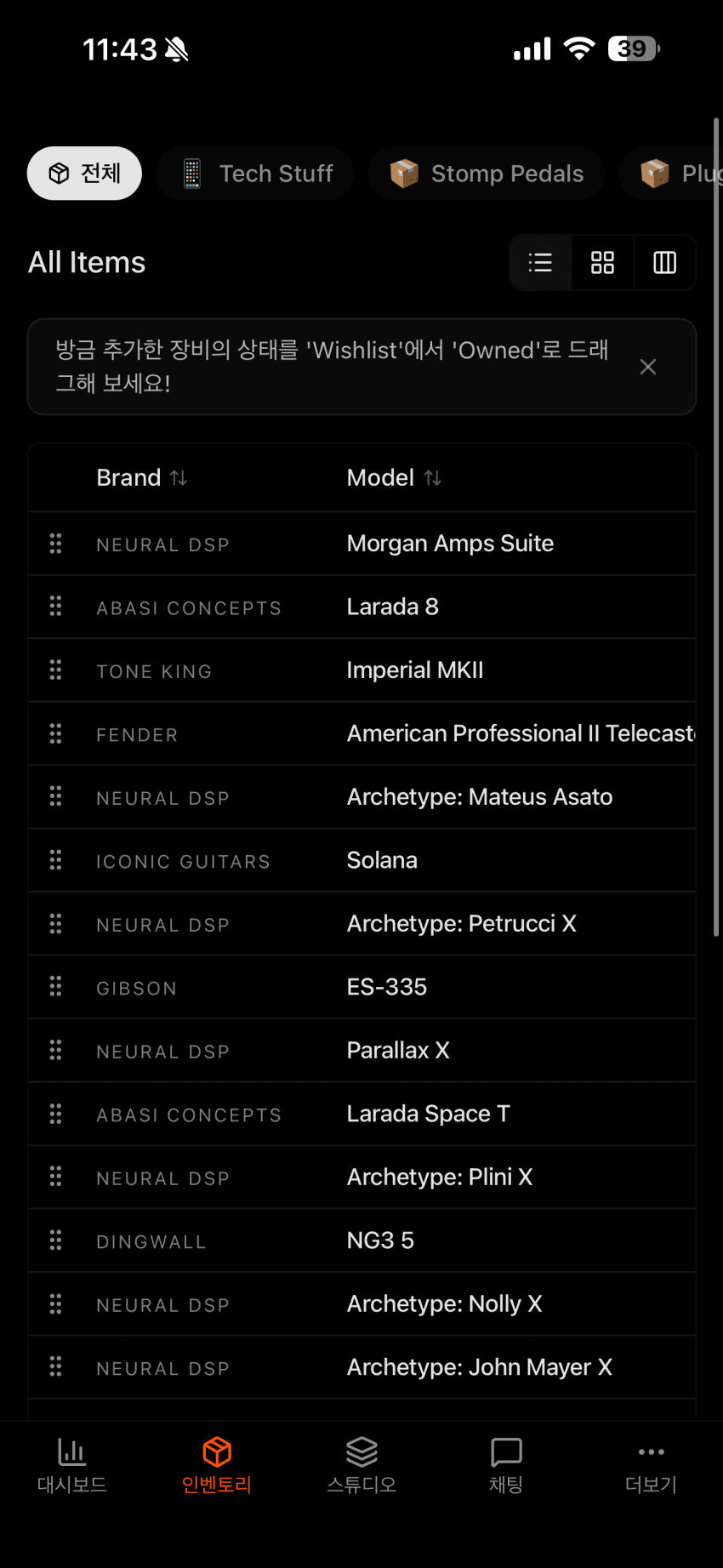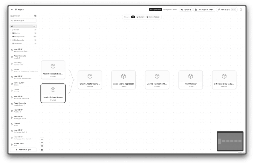 - 시그널 체인 구성 (페달보드 뷰도 만들어뒀는데 사이즈가 입력이 안되어 있어서 직접 입력해야 함)